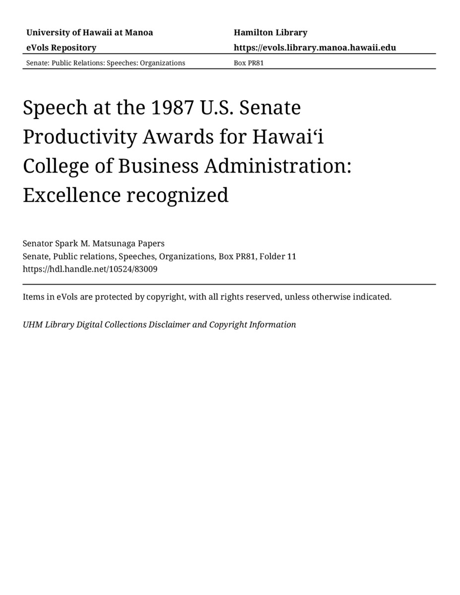 - Speech at the 1987 U.S. Senate Productivity Awards for Hawaiʻi College of Business Administration: Excellence recognized
