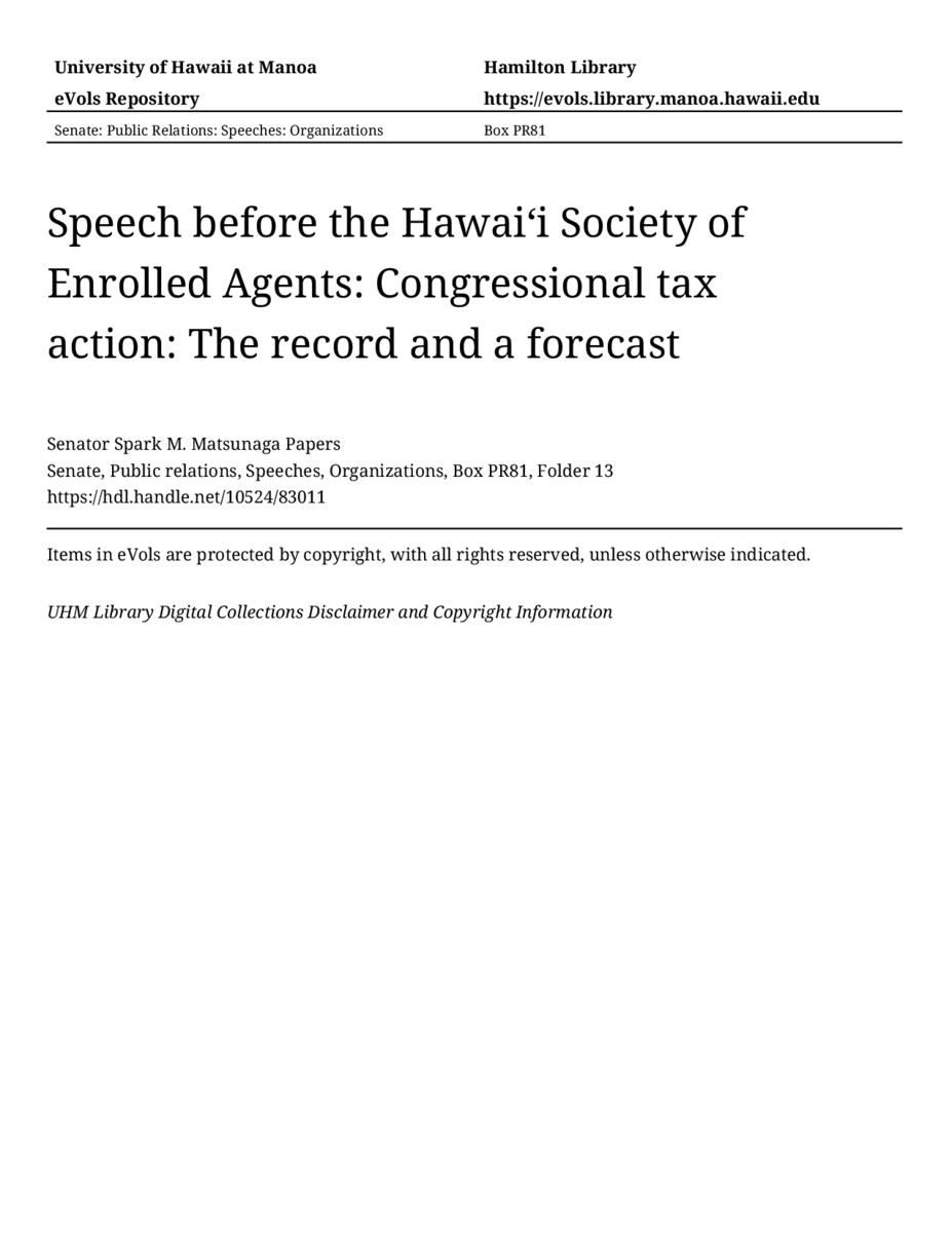 - Speech before the Hawaiʻi Society of Enrolled Agents: Congressional tax action: The record and a forecast