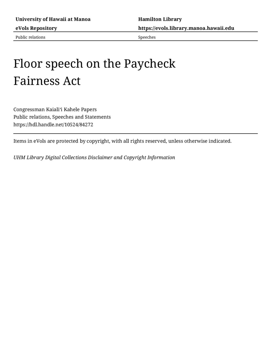 Floor speech on the Paycheck Fairness Act, 4/15/2021, Public relations, Speeches and Statements, Congressman Kaialiʻi Kahele Papers, Hawaiʻi Congressional Papers Collection, University of Hawaiʻi at Mānoa Library, Honolulu, HI. https://omekas-congress.lib.wvu.edu/catalog/10524_84272 (accessed April 10, 2026).