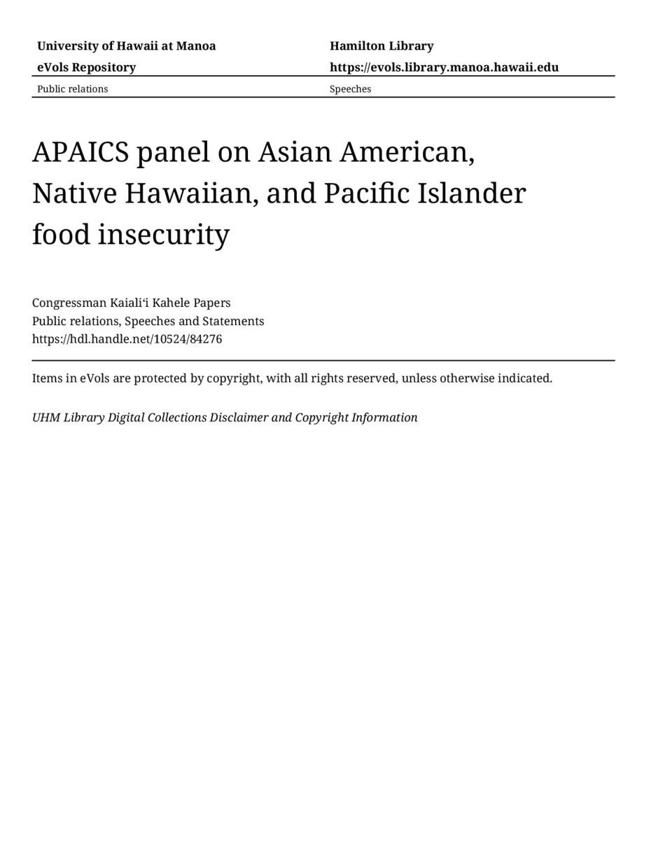 APAICS panel on Asian American, Native Hawaiian, and Pacific Islander food insecurity, 5/10/2021, Public relations, Speeches and Statements, Congressman Kaialiʻi Kahele Papers, Hawaiʻi Congressional Papers Collection, University of Hawaiʻi at Mānoa Library, Honolulu, HI. https://omekas-congress.lib.wvu.edu/catalog/10524_84276 (accessed April 12, 2026).