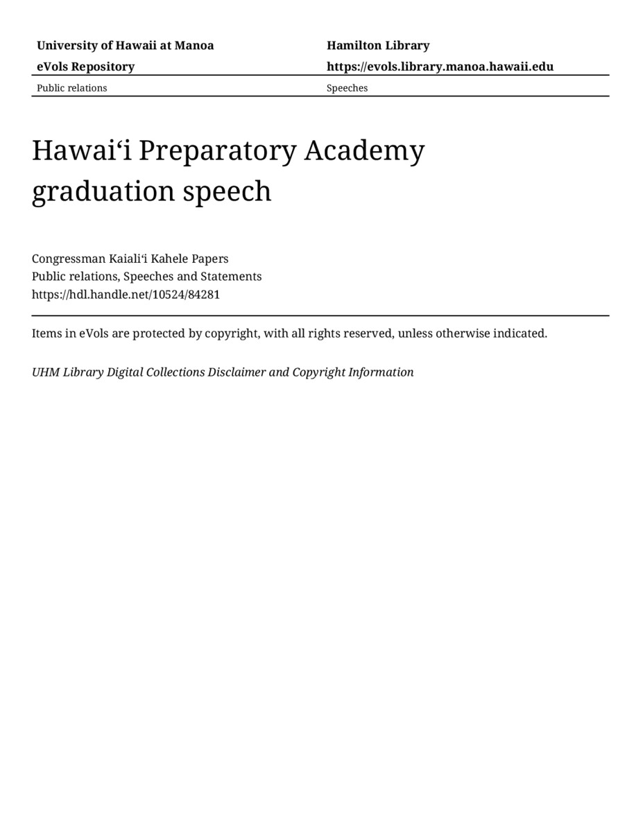 Hawaiʻi Preparatory Academy graduation speech, 5/13/2021, Public relations, Speeches and Statements, Congressman Kaialiʻi Kahele Papers, Hawaiʻi Congressional Papers Collection, University of Hawaiʻi at Mānoa Library, Honolulu, HI. https://omekas-congress.lib.wvu.edu/catalog/10524_84281 (accessed April 12, 2026).