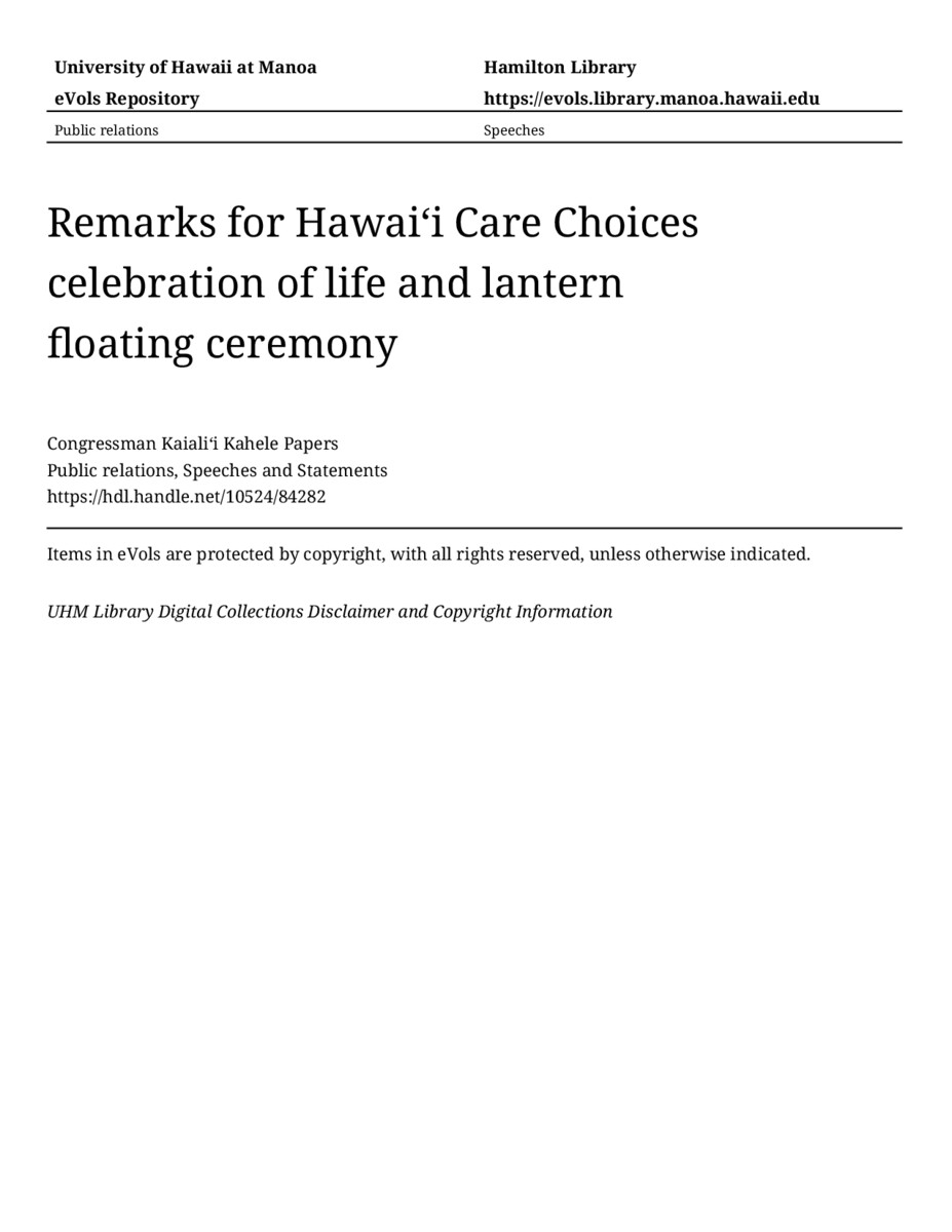 Remarks for Hawaiʻi Care Choices celebration of life and lantern floating ceremony, 5/13/2021, Public relations, Speeches and Statements, Congressman Kaialiʻi Kahele Papers, Hawaiʻi Congressional Papers Collection, University of Hawaiʻi at Mānoa Library, Honolulu, HI. https://omekas-congress.lib.wvu.edu/catalog/10524_84282 (accessed April 12, 2026).