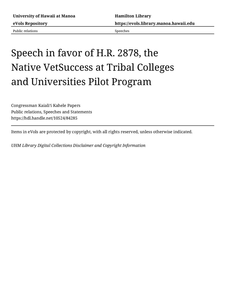 Speech in favor of H.R. 2878, the Native VetSuccess at Tribal Colleges and Universities Pilot Program, 5/16/2021, Public relations, Speeches and Statements, Congressman Kaialiʻi Kahele Papers, Hawaiʻi Congressional Papers Collection, University of Hawaiʻi at Mānoa Library, Honolulu, HI. https://omekas-congress.lib.wvu.edu/catalog/10524_84285 (accessed April 11, 2026).
