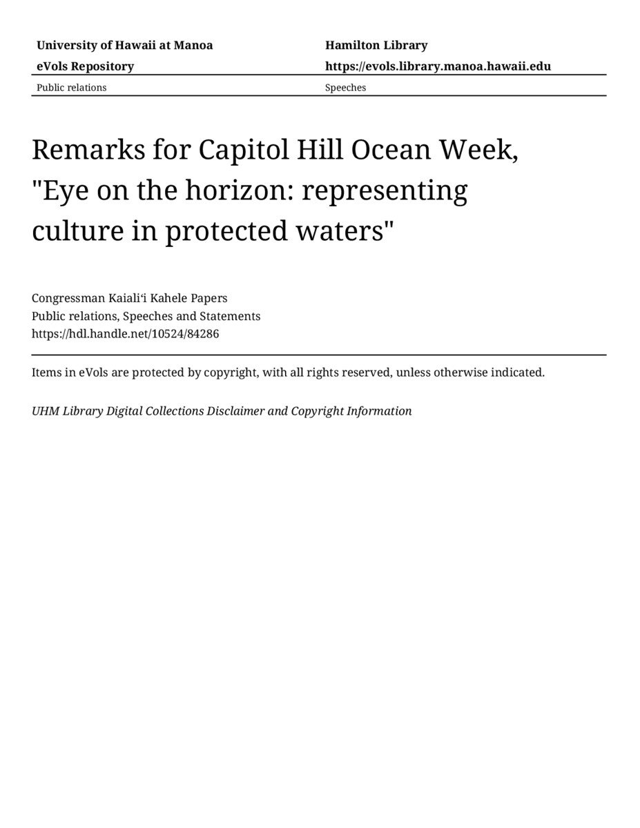 Remarks for Capitol Hill Ocean Week, "Eye on the horizon: representing culture in protected waters", 5/18/2021, Public relations, Speeches and Statements, Congressman Kaialiʻi Kahele Papers, Hawaiʻi Congressional Papers Collection, University of Hawaiʻi at Mānoa Library, Honolulu, HI. https://omekas-congress.lib.wvu.edu/catalog/10524_84286 (accessed April 09, 2026).