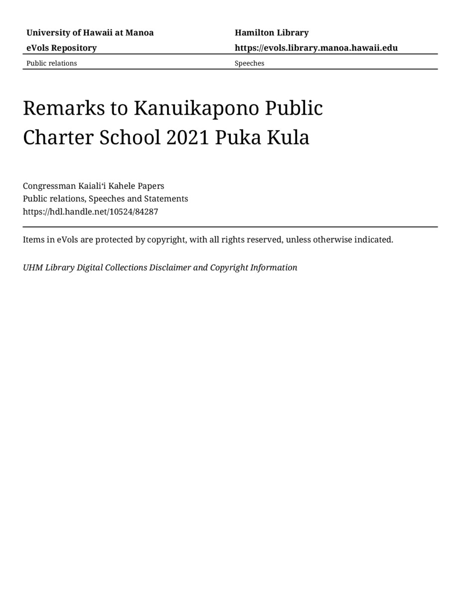 Remarks to Kanuikapono Public Charter School 2021 Puka Kula, 5/18/2021, Public relations, Speeches and Statements, Congressman Kaialiʻi Kahele Papers, Hawaiʻi Congressional Papers Collection, University of Hawaiʻi at Mānoa Library, Honolulu, HI. https://omekas-congress.lib.wvu.edu/catalog/10524_84287 (accessed April 10, 2026).