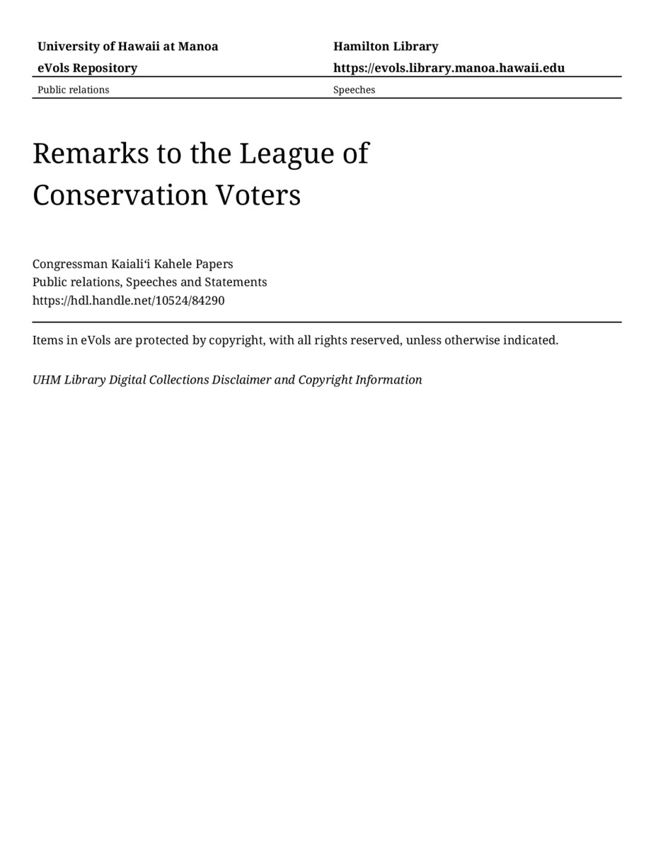 Remarks to the League of Conservation Voters, 5/20/2021, Public relations, Speeches and Statements, Congressman Kaialiʻi Kahele Papers, Hawaiʻi Congressional Papers Collection, University of Hawaiʻi at Mānoa Library, Honolulu, HI. https://omekas-congress.lib.wvu.edu/catalog/10524_84290 (accessed April 09, 2026).