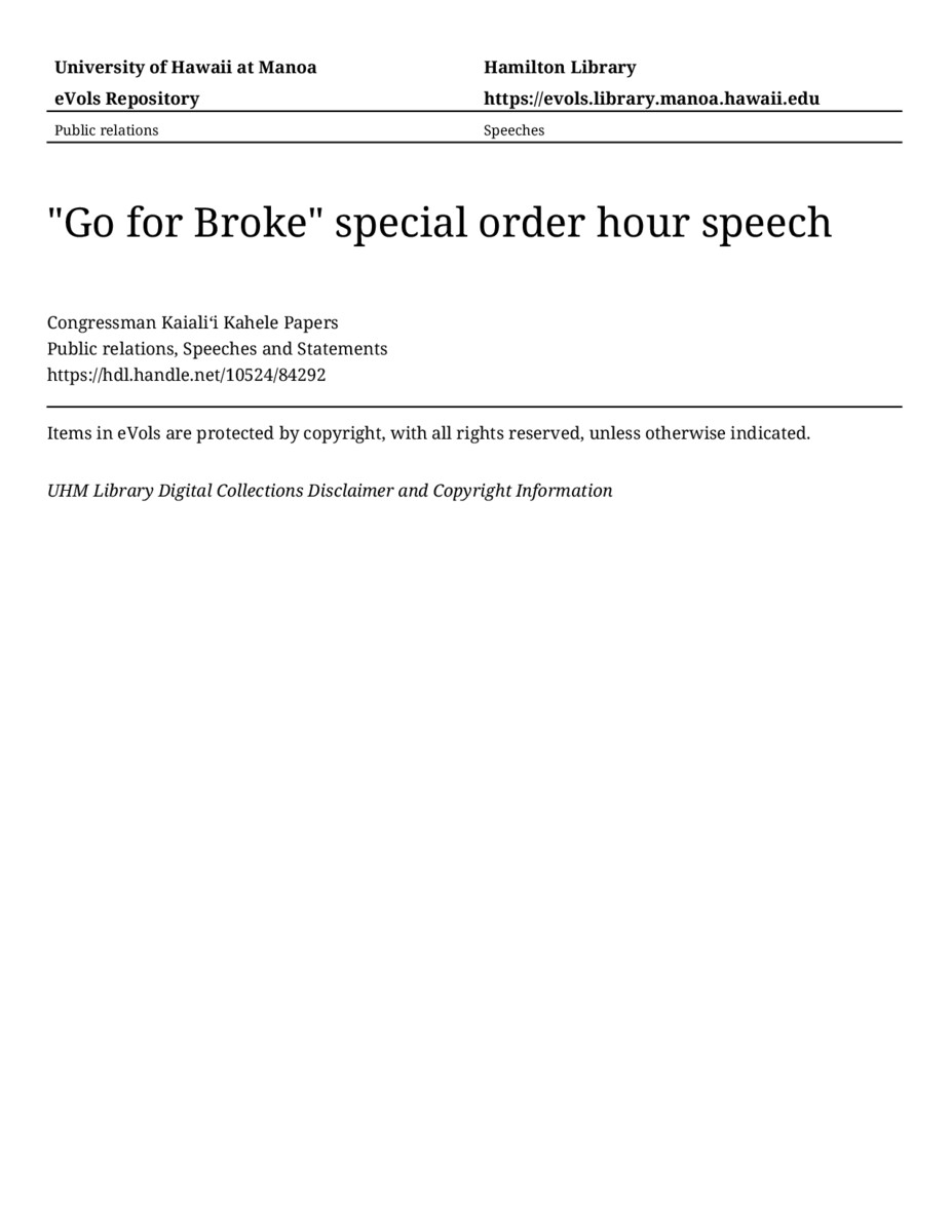 "Go for Broke" special order hour speech, 6/10/2021, Public relations, Speeches and Statements, Congressman Kaialiʻi Kahele Papers, Hawaiʻi Congressional Papers Collection, University of Hawaiʻi at Mānoa Library, Honolulu, HI. https://omekas-congress.lib.wvu.edu/catalog/10524_84292 (accessed April 10, 2026).