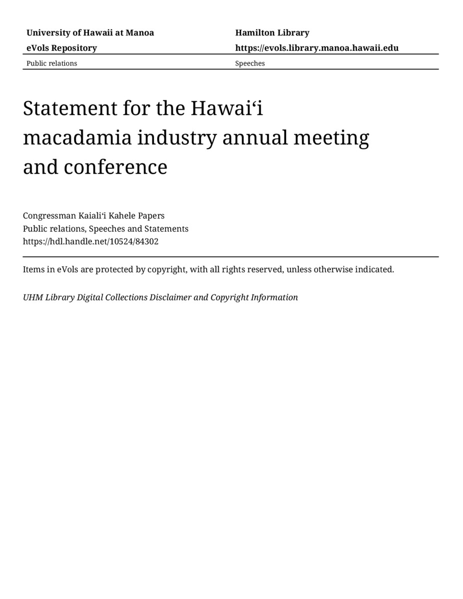 Statement for the Hawaiʻi macadamia industry annual meeting and conference, 7/7/2021, Public relations, Speeches and Statements, Congressman Kaialiʻi Kahele Papers, Hawaiʻi Congressional Papers Collection, University of Hawaiʻi at Mānoa Library, Honolulu, HI. https://omekas-congress.lib.wvu.edu/catalog/10524_84302 (accessed April 12, 2026).