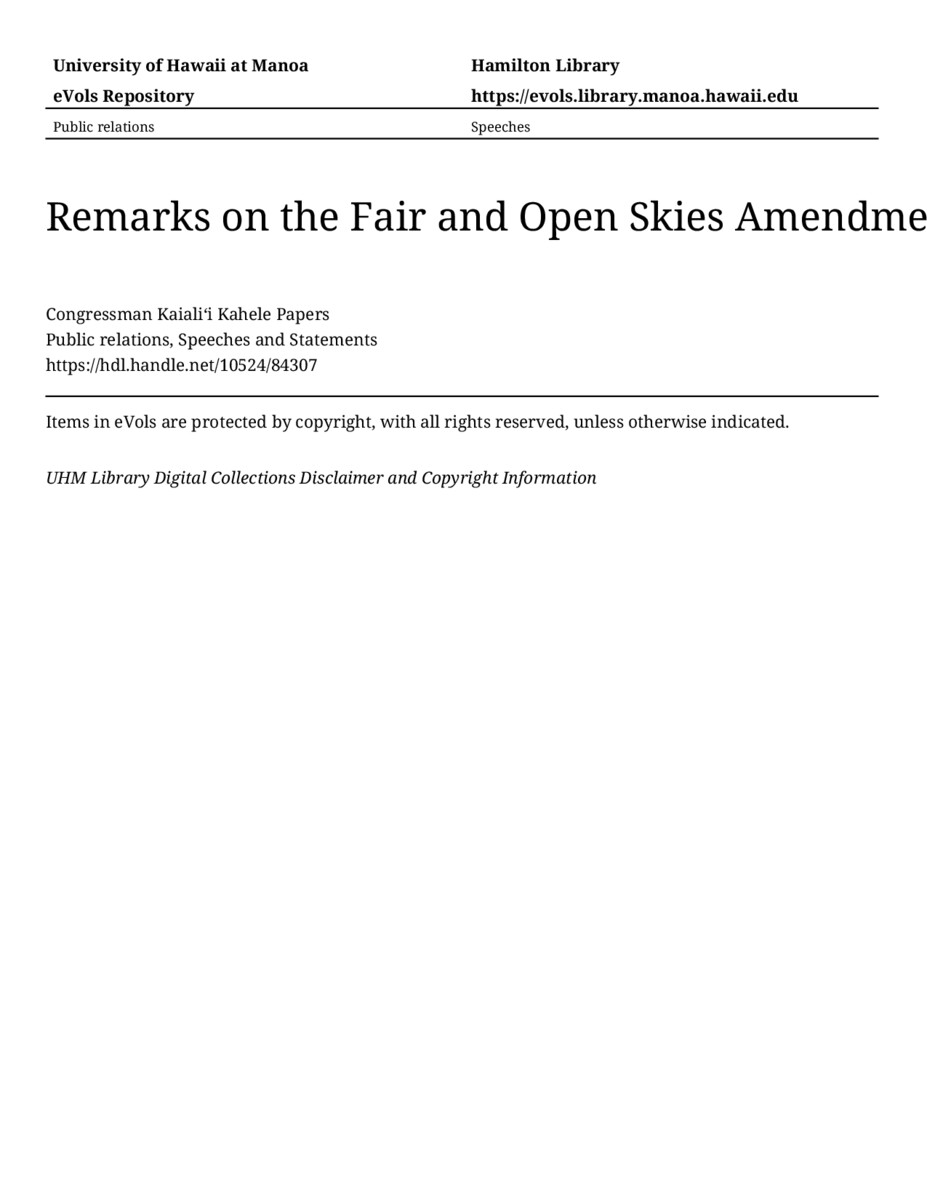 Remarks on the Fair and Open Skies Amendment, 7/27/2021, Public relations, Speeches and Statements, Congressman Kaialiʻi Kahele Papers, Hawaiʻi Congressional Papers Collection, University of Hawaiʻi at Mānoa Library, Honolulu, HI. https://omekas-congress.lib.wvu.edu/catalog/10524_84307 (accessed April 11, 2026).