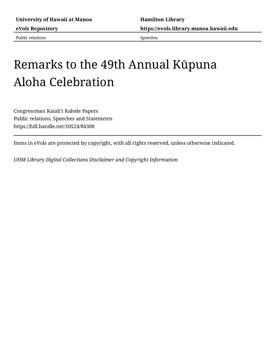 Remarks to the 49th Annual Kūpuna Aloha Celebration, 7/27/2021, Public relations, Speeches and Statements, Congressman Kaialiʻi Kahele Papers, Hawaiʻi Congressional Papers Collection, University of Hawaiʻi at Mānoa Library, Honolulu, HI. https://omekas-congress.lib.wvu.edu/catalog/10524_84308 (accessed April 11, 2026).