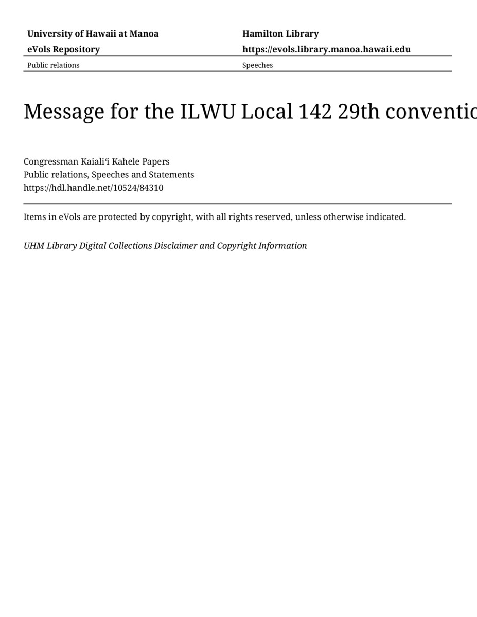 Message for the ILWU Local 142 29th convention, 8/31/2021, Public relations, Speeches and Statements, Congressman Kaialiʻi Kahele Papers, Hawaiʻi Congressional Papers Collection, University of Hawaiʻi at Mānoa Library, Honolulu, HI. https://omekas-congress.lib.wvu.edu/catalog/10524_84310 (accessed April 12, 2026).