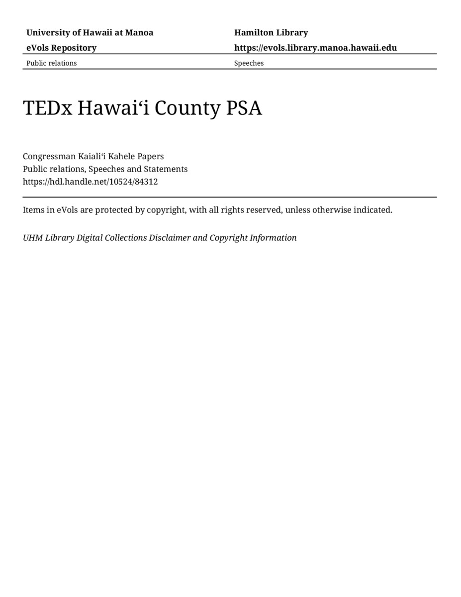 TEDx Hawaiʻi County PSA, 9/23/2021, Public relations, Speeches and Statements, Congressman Kaialiʻi Kahele Papers, Hawaiʻi Congressional Papers Collection, University of Hawaiʻi at Mānoa Library, Honolulu, HI. https://omekas-congress.lib.wvu.edu/catalog/10524_84312 (accessed April 12, 2026).