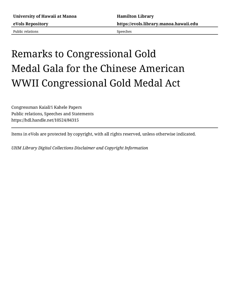 Remarks to Congressional Gold Medal Gala for the Chinese American WWII Congressional Gold Medal Act, 9/30/2021, Public relations, Speeches and Statements, Congressman Kaialiʻi Kahele Papers, Hawaiʻi Congressional Papers Collection, University of Hawaiʻi at Mānoa Library, Honolulu, HI. https://omekas-congress.lib.wvu.edu/catalog/10524_84315 (accessed April 10, 2026).
