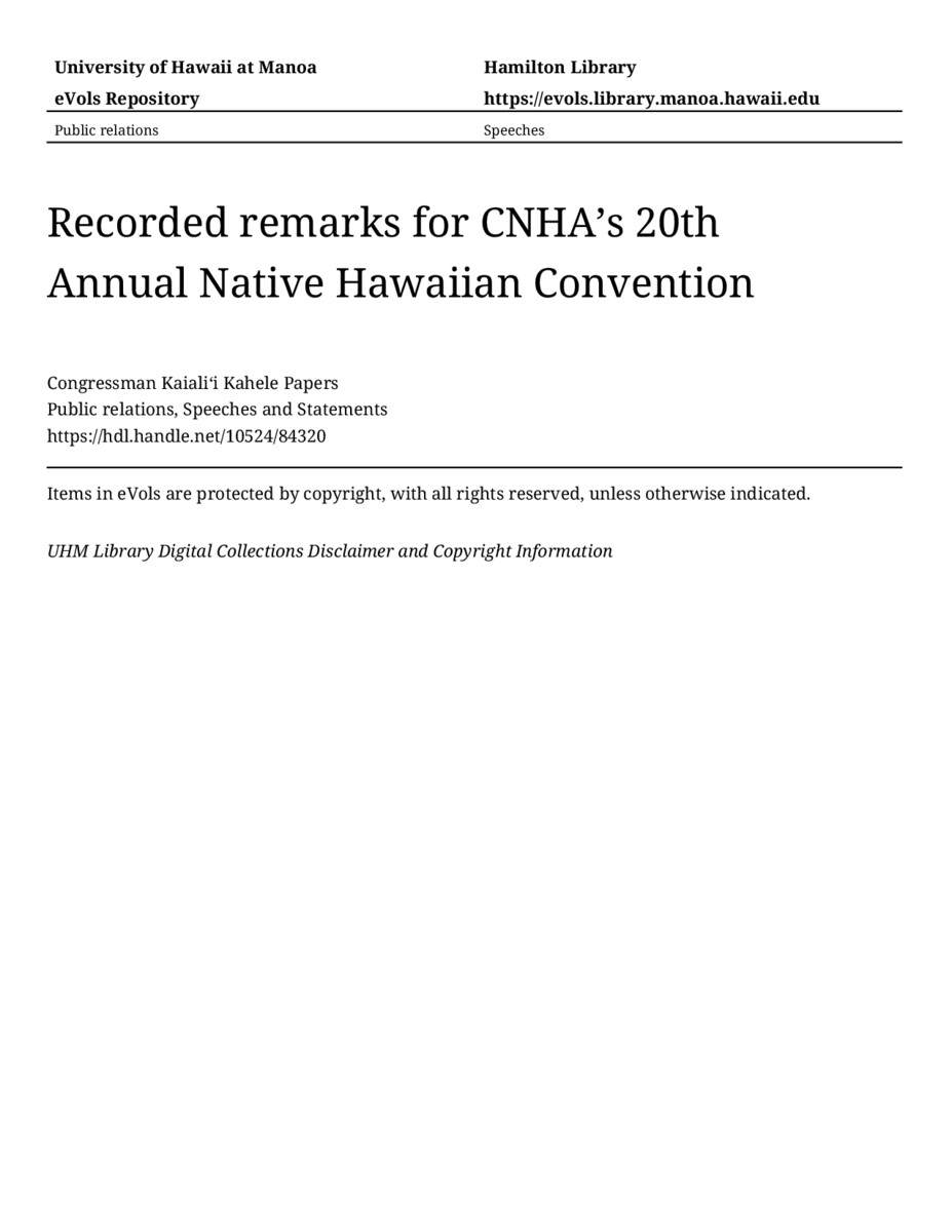 Recorded remarks for CNHA’s 20th Annual Native Hawaiian Convention, 10/26/2021, Public relations, Speeches and Statements, Congressman Kaialiʻi Kahele Papers, Hawaiʻi Congressional Papers Collection, University of Hawaiʻi at Mānoa Library, Honolulu, HI. https://omekas-congress.lib.wvu.edu/catalog/10524_84320 (accessed April 10, 2026).
