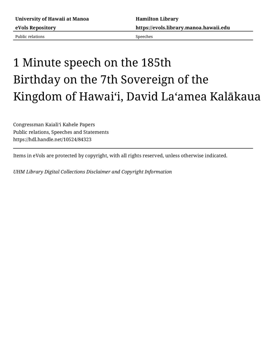 1 Minute speech on the 185th Birthday on the 7th Sovereign of the Kingdom of Hawaiʻi, David La‘amea Kalākaua, 11/16/2021, Public relations, Speeches and Statements, Congressman Kaialiʻi Kahele Papers, Hawaiʻi Congressional Papers Collection, University of Hawaiʻi at Mānoa Library, Honolulu, HI. https://omekas-congress.lib.wvu.edu/catalog/10524_84323 (accessed April 10, 2026).