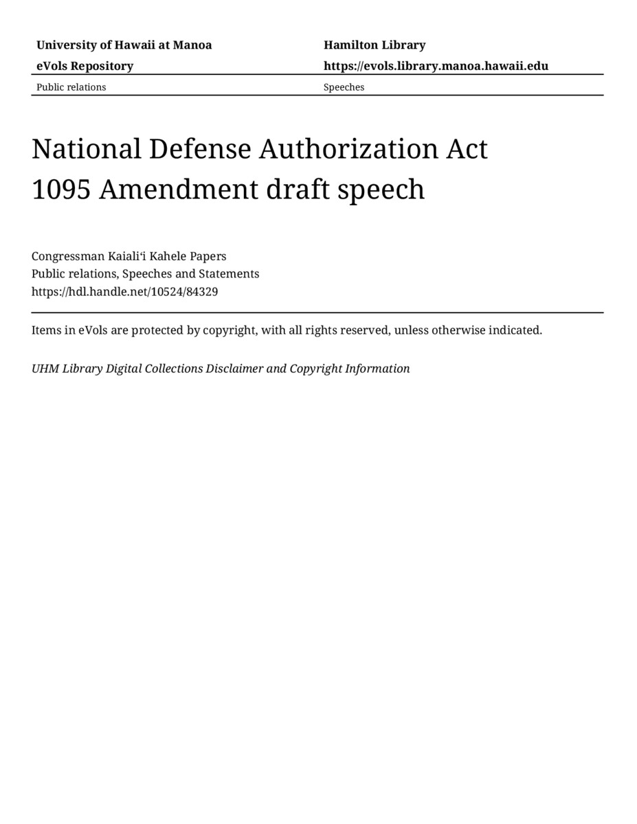 National Defense Authorization Act 1095 Amendment draft speech, 12/10/2021, Public relations, Speeches and Statements, Congressman Kaialiʻi Kahele Papers, Hawaiʻi Congressional Papers Collection, University of Hawaiʻi at Mānoa Library, Honolulu, HI. https://omekas-congress.lib.wvu.edu/catalog/10524_84329 (accessed April 12, 2026).