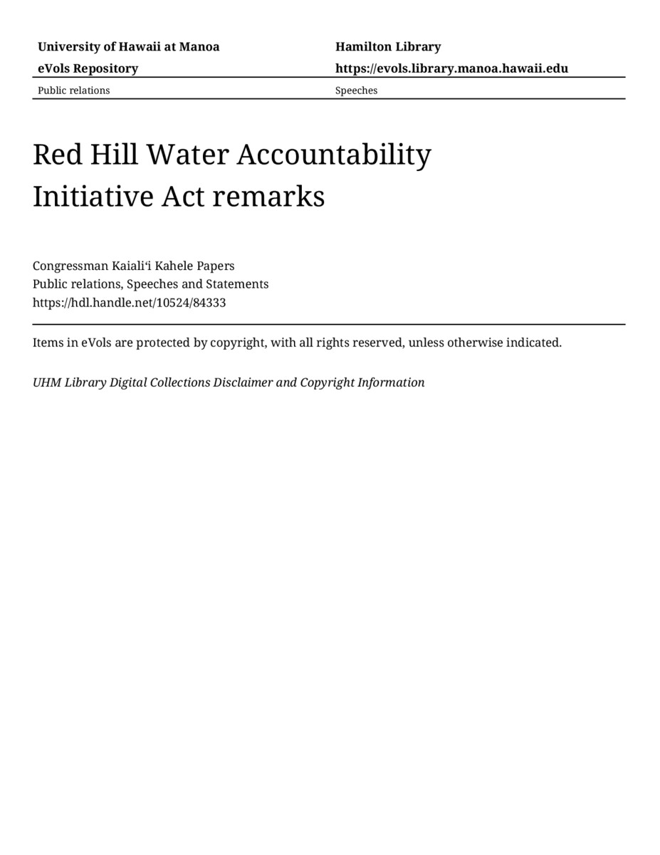Red Hill Water Accountability Initiative Act remarks, 2/11/2022, Public relations, Speeches and Statements, Congressman Kaialiʻi Kahele Papers, Hawaiʻi Congressional Papers Collection, University of Hawaiʻi at Mānoa Library, Honolulu, HI. https://omekas-congress.lib.wvu.edu/catalog/10524_84333 (accessed April 09, 2026).