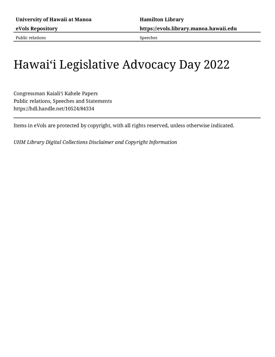 Hawaiʻi Legislative Advocacy Day 2022, 2/25/2022, Public relations, Speeches and Statements, Congressman Kaialiʻi Kahele Papers, Hawaiʻi Congressional Papers Collection, University of Hawaiʻi at Mānoa Library, Honolulu, HI. https://omekas-congress.lib.wvu.edu/catalog/10524_84334 (accessed April 12, 2026).