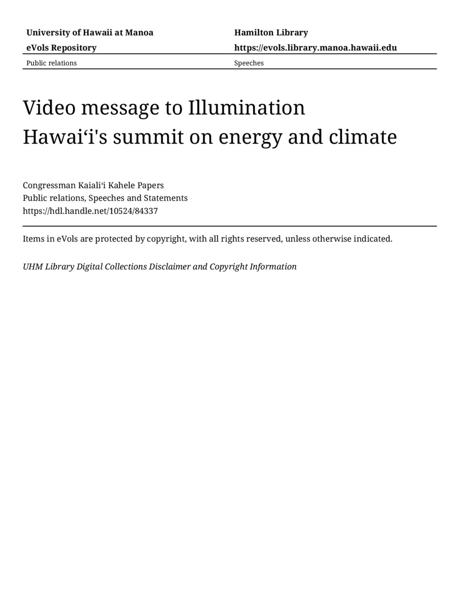 Video message to Illumination Hawaiʻi's summit on energy and climate, 3/2/2022, Public relations, Speeches and Statements, Congressman Kaialiʻi Kahele Papers, Hawaiʻi Congressional Papers Collection, University of Hawaiʻi at Mānoa Library, Honolulu, HI. https://omekas-congress.lib.wvu.edu/catalog/10524_84337 (accessed April 09, 2026).