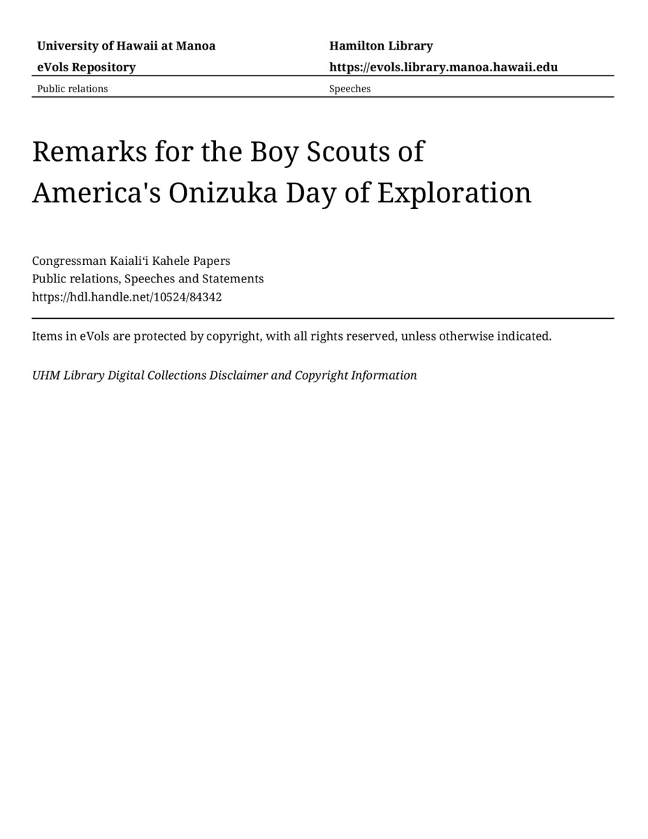 Remarks for the Boy Scouts of America's Onizuka Day of Exploration, 4/23/2022, Public relations, Speeches and Statements, Congressman Kaialiʻi Kahele Papers, Hawaiʻi Congressional Papers Collection, University of Hawaiʻi at Mānoa Library, Honolulu, HI. https://omekas-congress.lib.wvu.edu/catalog/10524_84342 (accessed April 13, 2026).