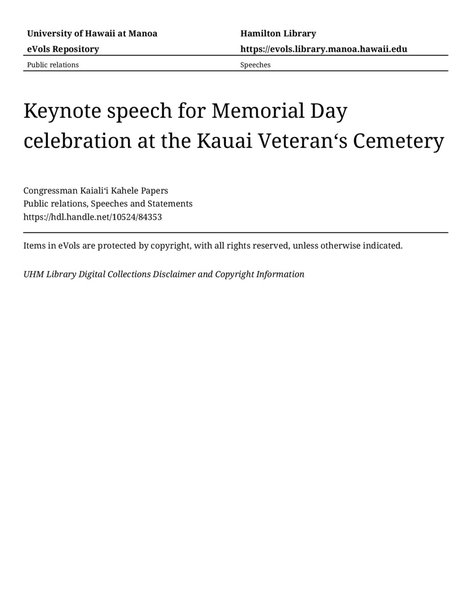 Keynote speech for Memorial Day celebration at the Kauai Veteranʻs Cemetery, 5/30/2022, Public relations, Speeches and Statements, Congressman Kaialiʻi Kahele Papers, Hawaiʻi Congressional Papers Collection, University of Hawaiʻi at Mānoa Library, Honolulu, HI. https://omekas-congress.lib.wvu.edu/catalog/10524_84353 (accessed April 10, 2026).