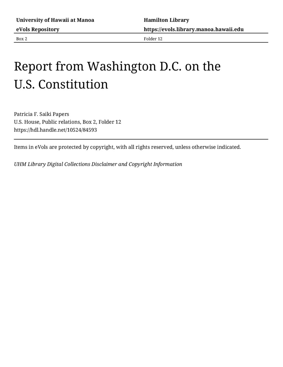 Report from Washington D.C. on the U.S. Constitution, 1987-09, U.S. House, Public relations, Box 2, Folder 12, Patricia F. Saiki Papers, Hawaiʻi Congressional Papers Collection, University of Hawaiʻi at Mānoa Library, Honolulu, HI. https://omekas-congress.lib.wvu.edu/catalog/10524_84593 (accessed April 18, 2026).