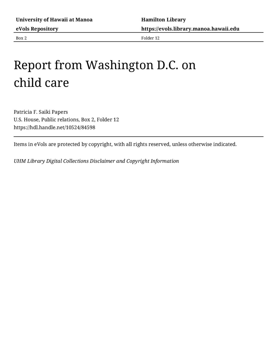Report from Washington D.C. on child care, 1988-01, U.S. House, Public relations, Box 2, Folder 12, Patricia F. Saiki Papers, Hawaiʻi Congressional Papers Collection, University of Hawaiʻi at Mānoa Library, Honolulu, HI. https://omekas-congress.lib.wvu.edu/catalog/10524_84598 (accessed April 20, 2026).