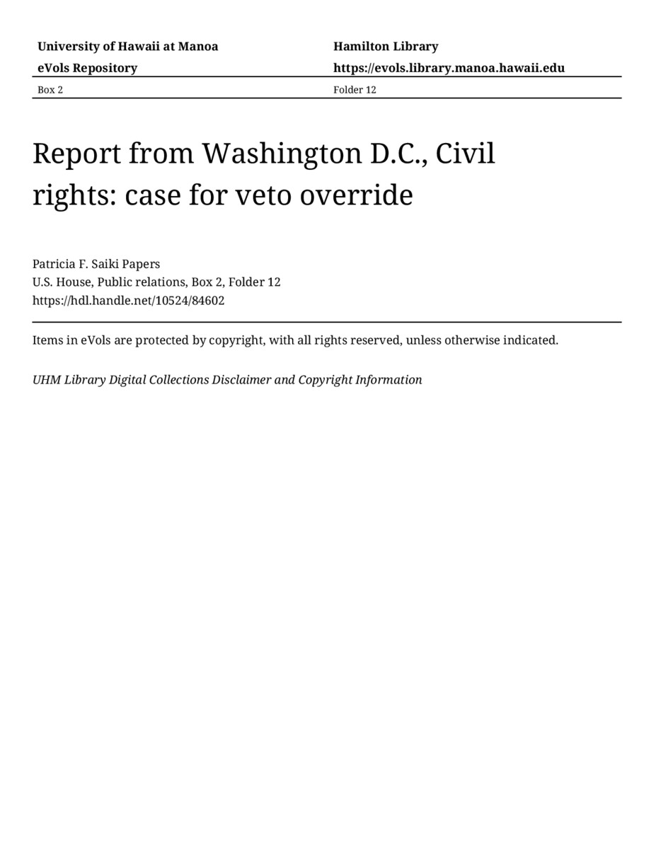 - Report from Washington D.C., Civil rights: case for veto override