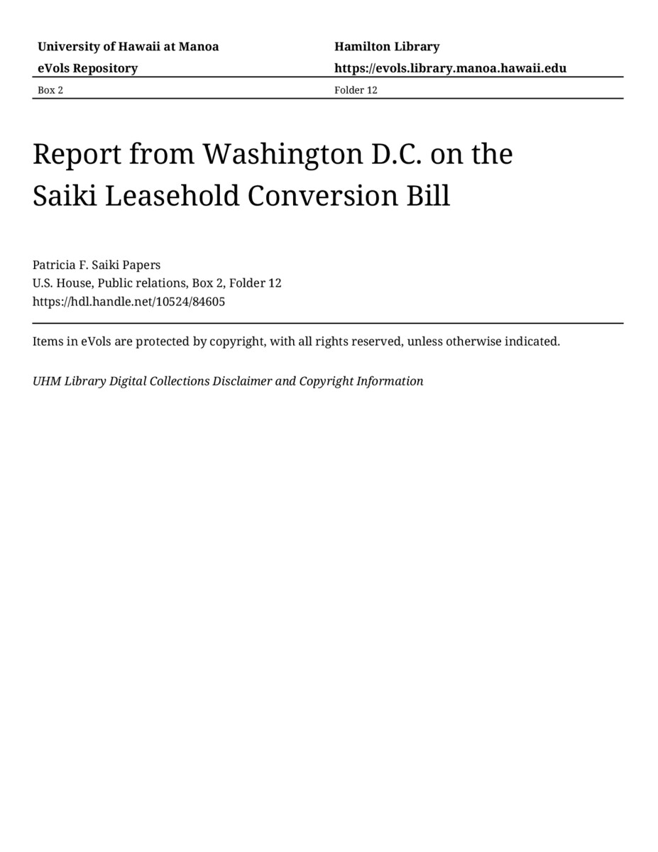 Report from Washington D.C. on the Saiki Leasehold Conversion Bill, 1988-06, U.S. House, Public relations, Box 2, Folder 12, Patricia F. Saiki Papers, Hawaiʻi Congressional Papers Collection, University of Hawaiʻi at Mānoa Library, Honolulu, HI. https://omekas-congress.lib.wvu.edu/catalog/10524_84605 (accessed April 09, 2026).