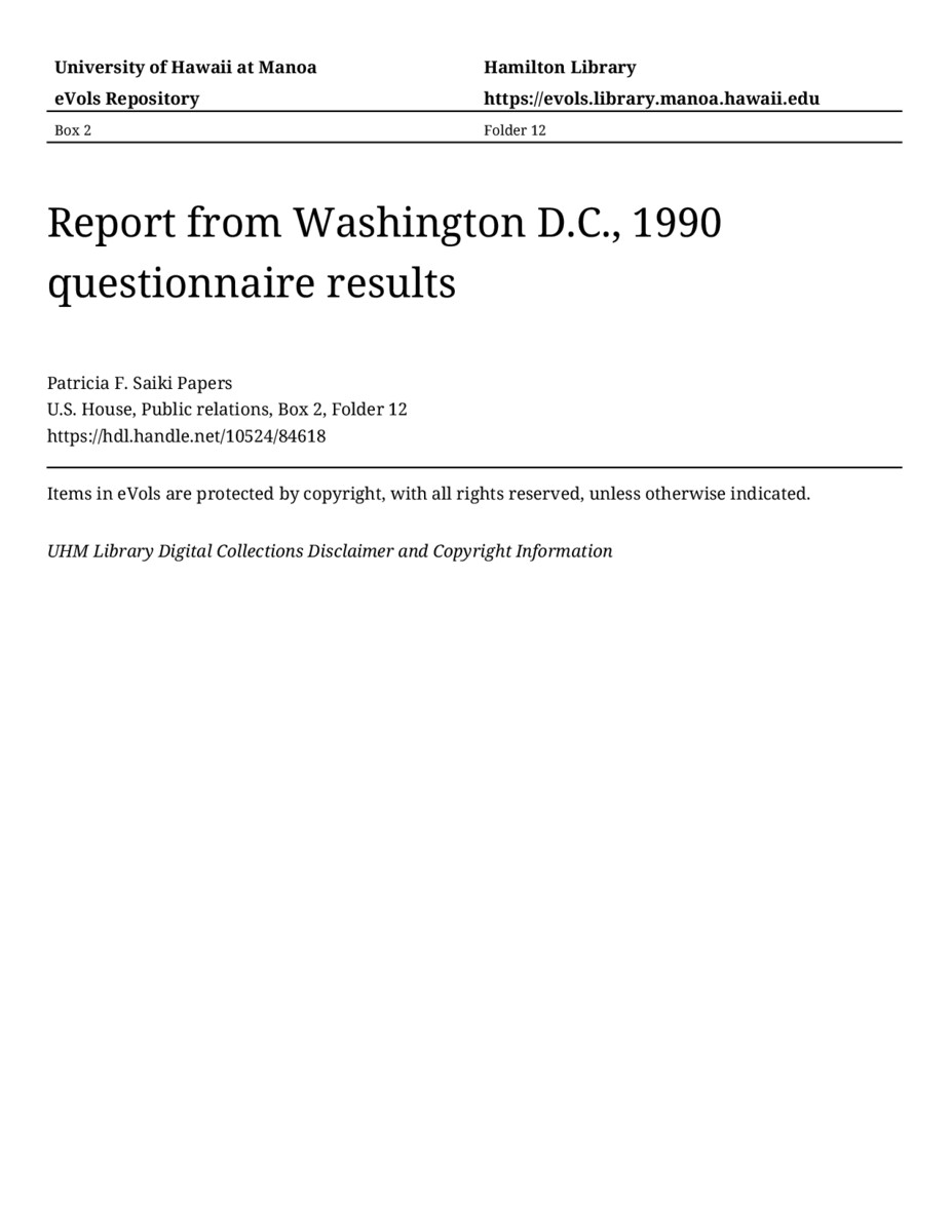 Report from Washington D.C., 1990 questionnaire results, 1989-08, U.S. House, Public relations, Box 2, Folder 12, Patricia F. Saiki Papers, Hawaiʻi Congressional Papers Collection, University of Hawaiʻi at Mānoa Library, Honolulu, HI. https://omekas-congress.lib.wvu.edu/catalog/10524_84618 (accessed April 19, 2026).