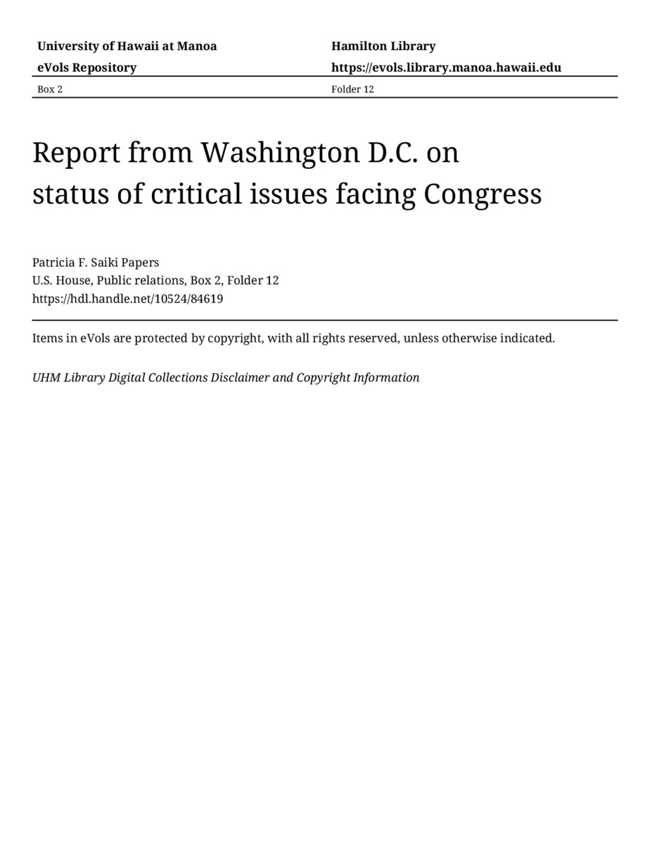 Report from Washington D.C. on status of critical issues facing Congress, 1989-10, U.S. House, Public relations, Box 2, Folder 12, Patricia F. Saiki Papers, Hawaiʻi Congressional Papers Collection, University of Hawaiʻi at Mānoa Library, Honolulu, HI. https://omekas-congress.lib.wvu.edu/catalog/10524_84619 (accessed April 19, 2026).