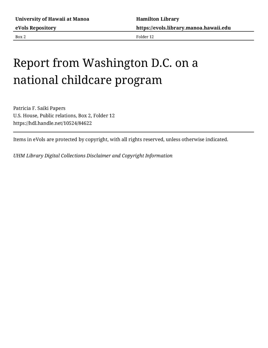 Report from Washington D.C. on a national childcare program, 1990-04, U.S. House, Public relations, Box 2, Folder 12, Patricia F. Saiki Papers, Hawaiʻi Congressional Papers Collection, University of Hawaiʻi at Mānoa Library, Honolulu, HI. https://omekas-congress.lib.wvu.edu/catalog/10524_84622 (accessed April 19, 2026).