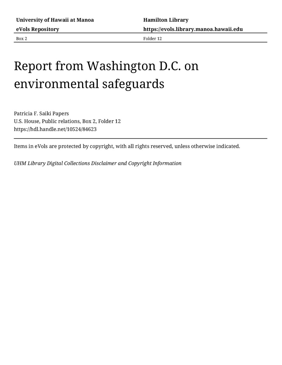 Report from Washington D.C. on environmental safeguards, 1990-05, U.S. House, Public relations, Box 2, Folder 12, Patricia F. Saiki Papers, Hawaiʻi Congressional Papers Collection, University of Hawaiʻi at Mānoa Library, Honolulu, HI. https://omekas-congress.lib.wvu.edu/catalog/10524_84623 (accessed April 12, 2026).